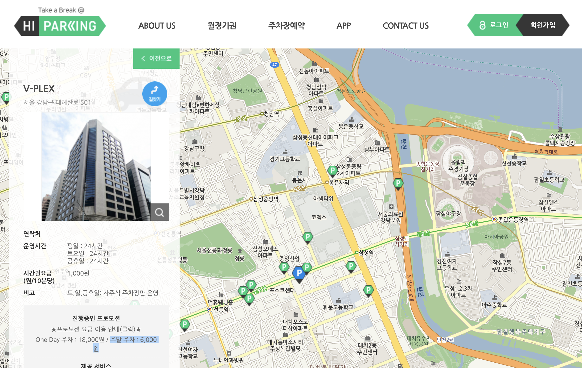 카카오T 주차 서비스를 통해 알게된 주차장인데요. 하이파킹 V-PLEX 를 이용하면 거리도 비교적 가까우면서 종일주차 6,000원에 가능합니다.