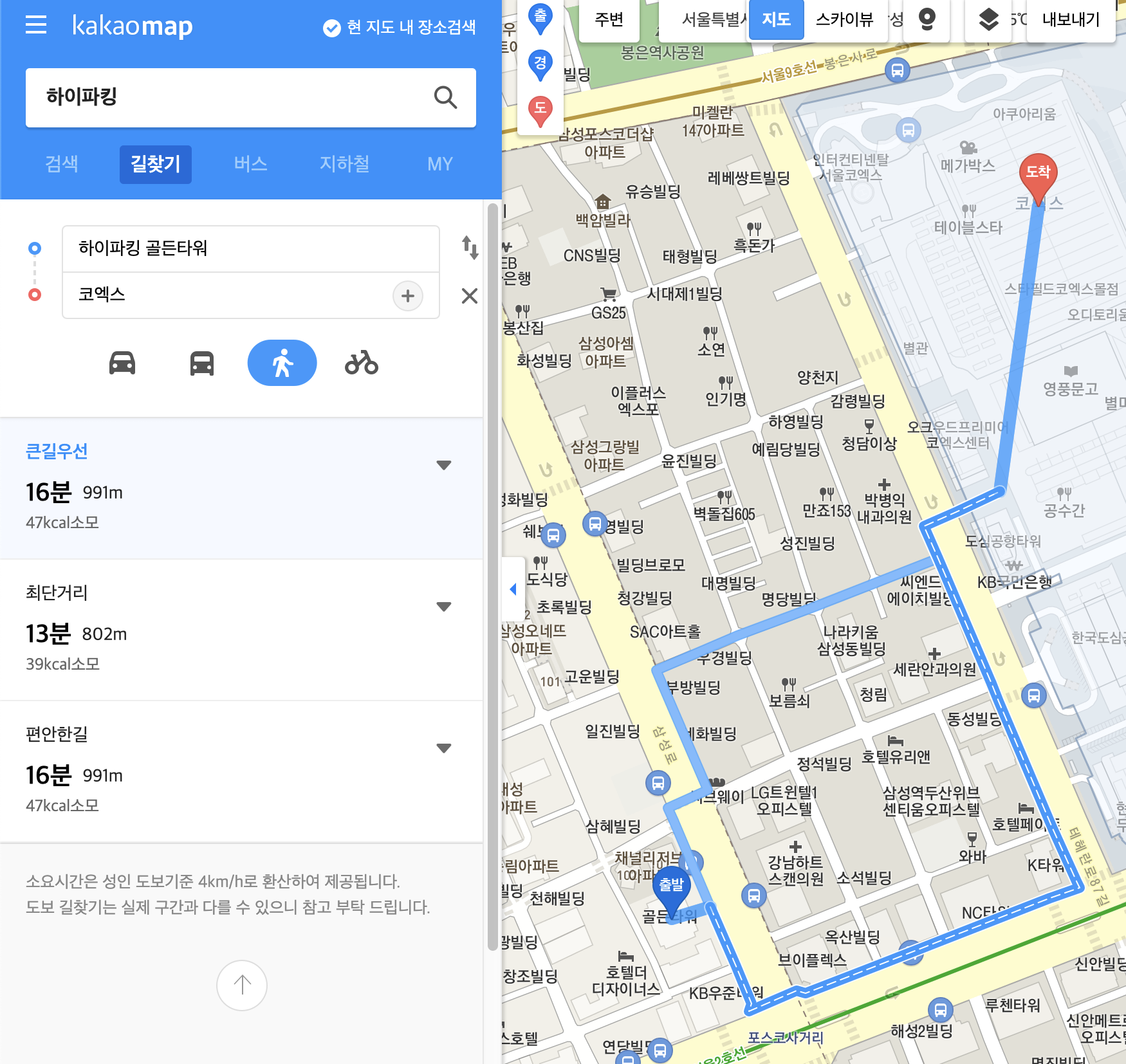 하이파킹 골든타워점에서 코엑스까지는 걸어서 16분 정도 걸립니다.