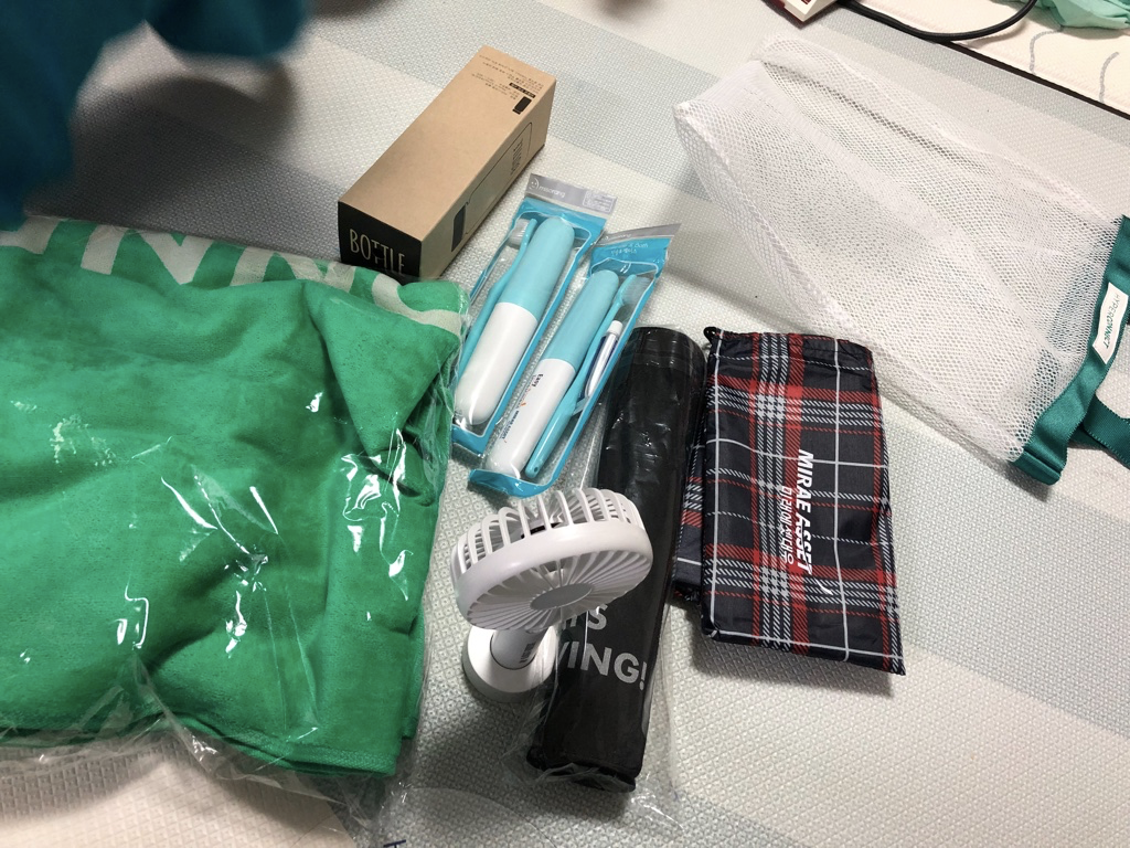 오늘도 여러가지 기념품들을 챙겨 왔습니다. 올해는 장패드를 주는 곳이 많더군요. 손풍기 주는 곳이 많이 줄어 들긴 했지만 하나 챙길 수 있었습니다. 아이들 닦일 때 사용할 큰 수건이 있었으면 했는데 하이퍼커넥트 감사합니다.