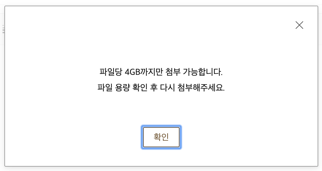 파일을 첨부 하려고 하면 4GB 까지만 첨부가 가능하다고 나타납니다. 저는 6GB 가 조금 넘는 파일을 보내야 하니 2개로 분할 하면 되었습니다.
