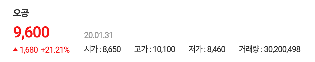 오공이라는 회사의 주식을 기준으로 보면 1월 20일 부터 8일 동안 주가가 기존대비 거의 3배 가까이 올라가는 모습을 보이고 있다.