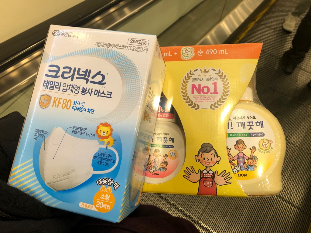 줄 서서 들어가 보았는데 대충 10명 정도 앞에서 중형 마이크도 동나고 어린이용 마스크만 남은 상태가 되어 버린 거 같았다. 아이들 거라도 사야 되겠다 싶어서 마스크랑 손세정제를 구입하였다. 다만 1인 1개만 구입할 수 있도록 제한하고 있었다. 물량은 얼마 없는데 사려는 사람이 많아서 그럴것이다.