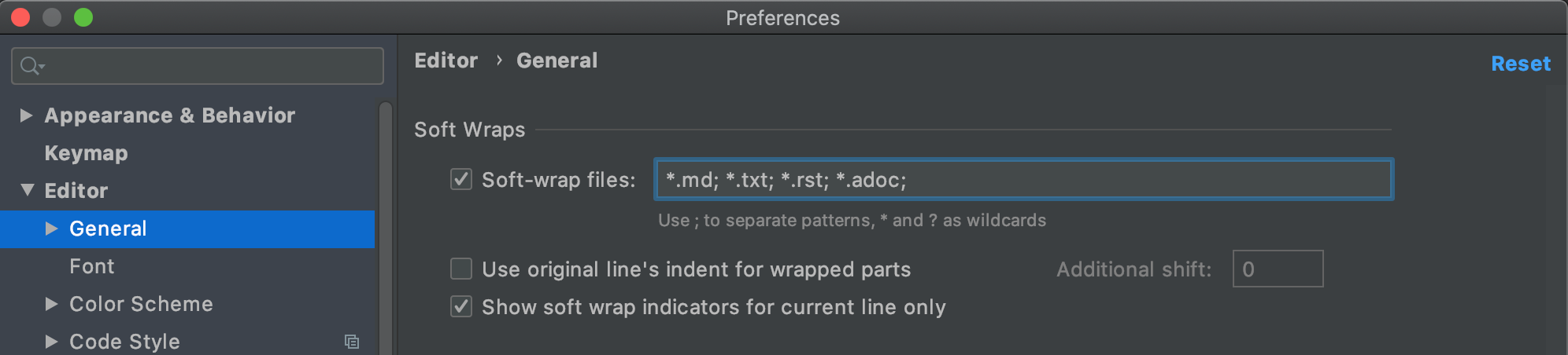 Soft-wrap files 의 체크박스를 활성화 시켜 줍니다. 기본 설정으로 *.md; *.txt, *.rst; *.adoc 의 파일들에 대해 자동으로 Soft-wrap 을 적용하도록 되어 있습니다. (*.md 는 확장자가 md 인 모든 파일을 의미합니다.) 여기다가 *.html 등의 파일을 추가해 줄 수 있습니다.