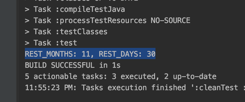 좀 복잡하지만 기존에 sql 로 구했던 결과처럼 REST_MONTHS: 11, REST_DAYS: 30 가 나옵니다.