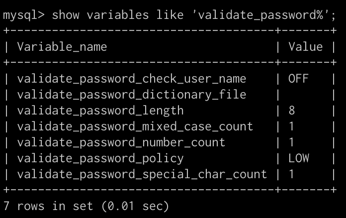 mysql> show variables like 'validate_password%';