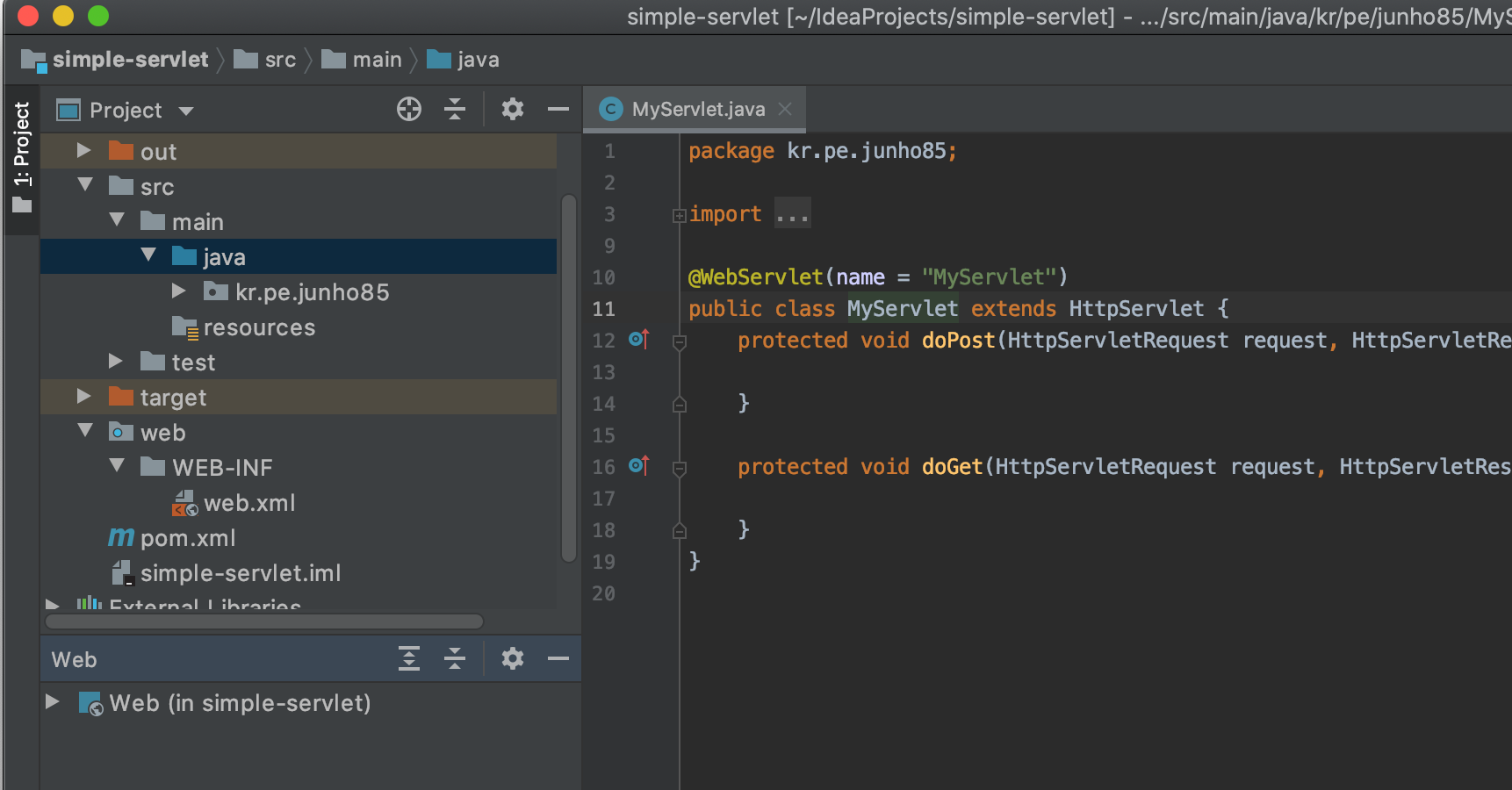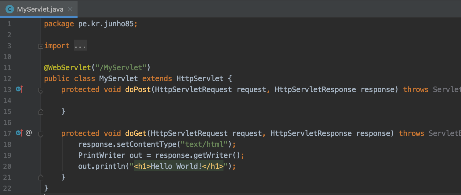 그리고 @WebServlet(name = "MyServlet")을 @WebServlet("/MyServlet")으로 수정합니다.