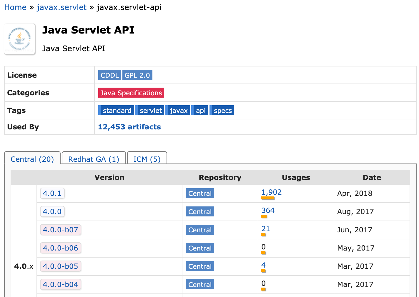 pom.xml 파일에 servlet api dependency를 추가해 줍니다. https://mvnrepository.com/artifact/javax.servlet/javax.servlet-api에서 maven 공개 저장소에 있는 버전과 xml 설정을 확인할 수 있습니다. 현재 4.0.1이 최신 버전이네요.