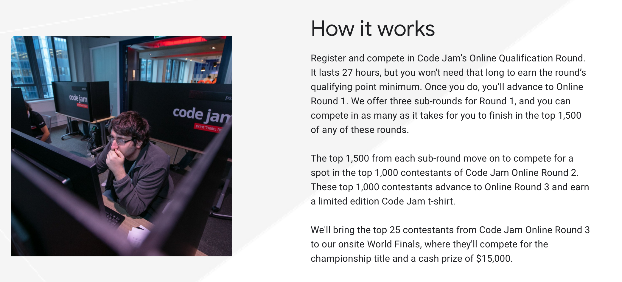 Round 3에 진출하게 되면 코드잼 티셔츠를 선물로 받을 수 있습니다. 전 세계에서 1,000명 안에 들어갔다는 의미가 되니 이 티셔츠를 입고 있는 사람은 이미 엄청난 실력자라고 볼 수 있겠습니다.