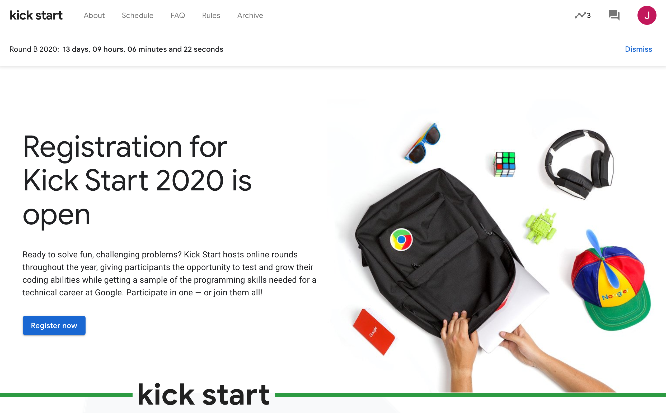 아참. 구글에서 주최하는 알고리즘 대회 중 하나인 킥스타트도 진행 중이네요. 코드잼보다는 난이도가 낮다고 하는데요. 관심 있으신 분들은 여기도 참여해 보면 좋을 거 같습니다.