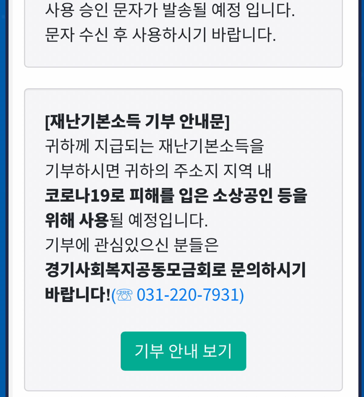 기부도 가능하다고 합니다. 기부를 하게 되면 소상공인 등을 위해 사용될 예정이라고 하네요.