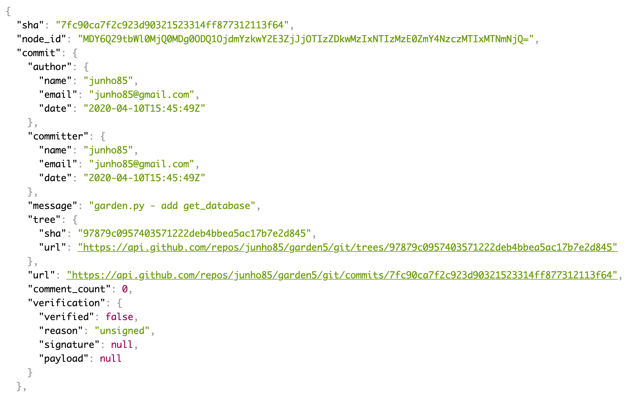 github commit은 commit마다 고유의 url을 가지게 됩니다. 예를 들면 https://github.com/junho85/garden5/commit/7fc90ca7f2c923d90321523314ff877312113f64입니다. 이 커밋의 정보를 github API를 이용해서 메타 정보를 불러올 수 있습니다.