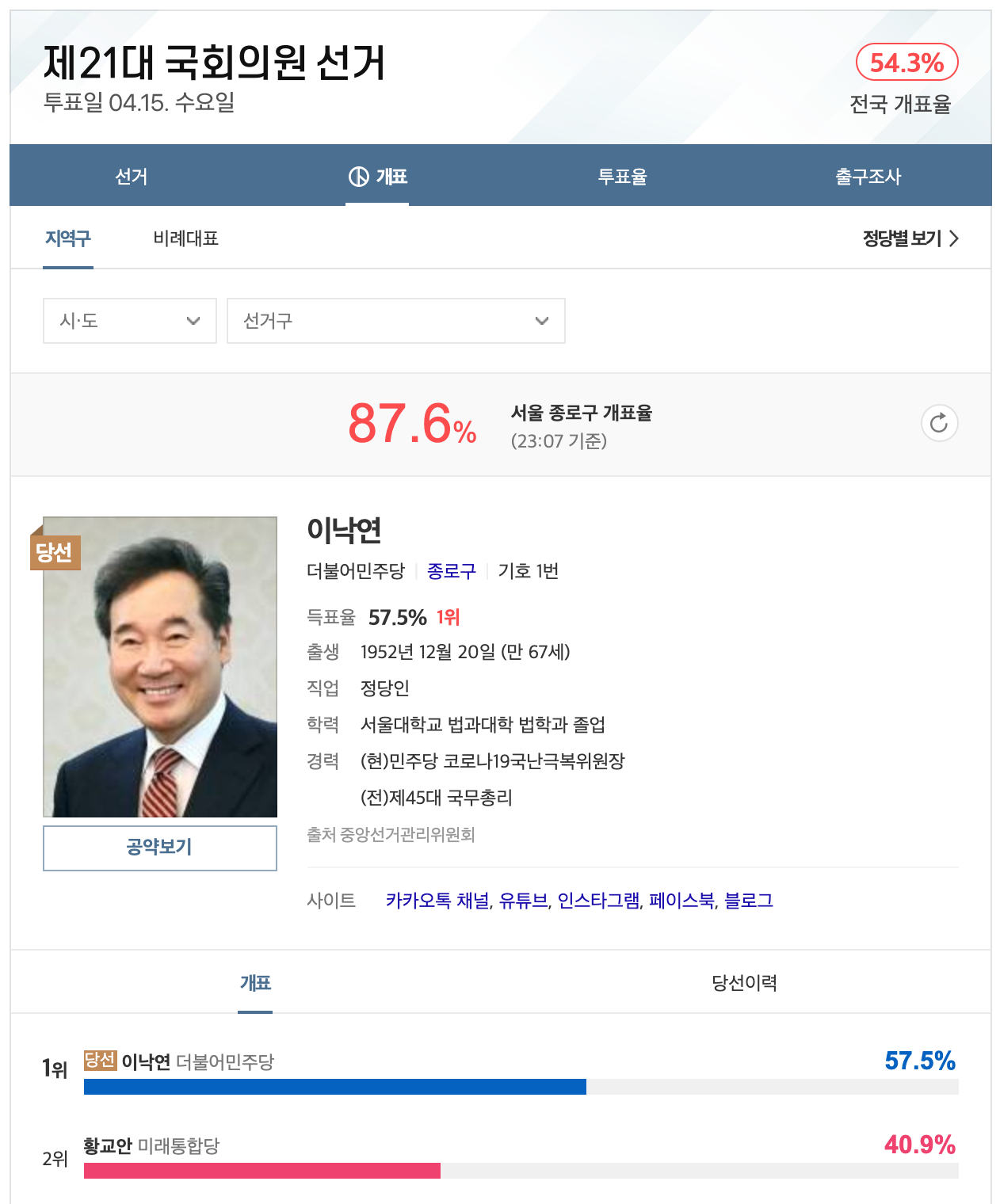 이낙연 후보가 당선되었네요. 이번 당선으로 차기 대선후보로의 지지도도 점점 높아질 거 같습니다.