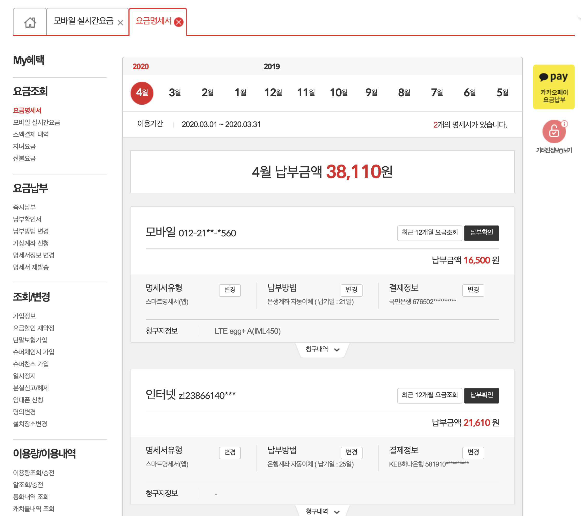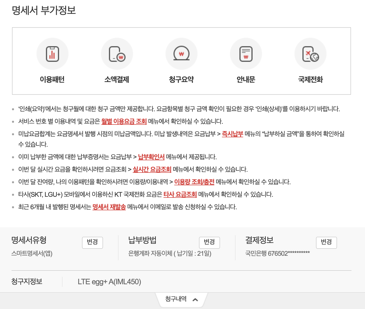 KT 모바일을 사용하지 않는 경우 조금 이상하게 동작하는 부분이 있긴 하지만 전반적으로 크게 이상하지 않는 UI인 거 같습니다. 청구요금은 강조하고 있고 상세 청구 내역도 쉽게 조회할 수 있습니다.