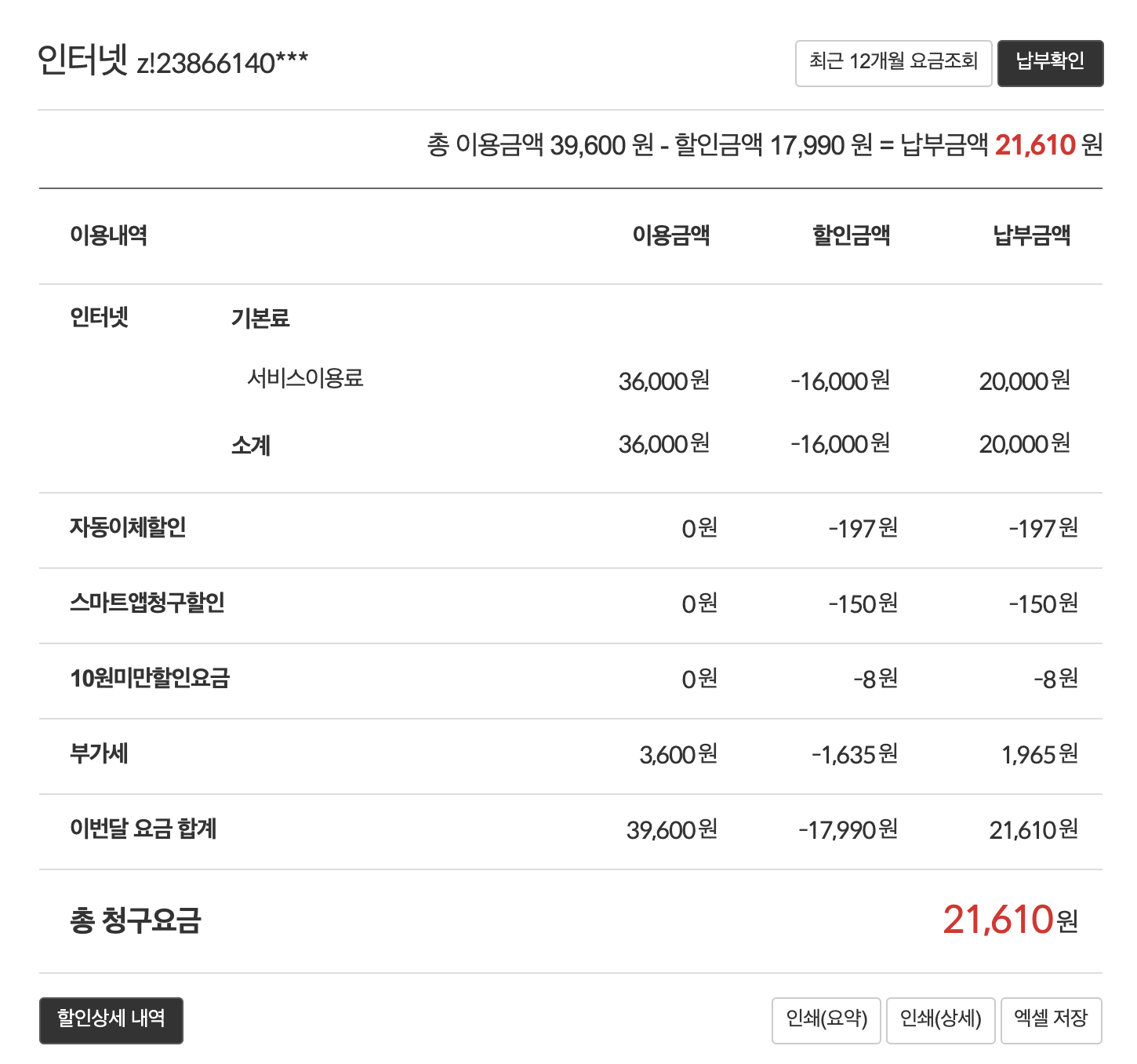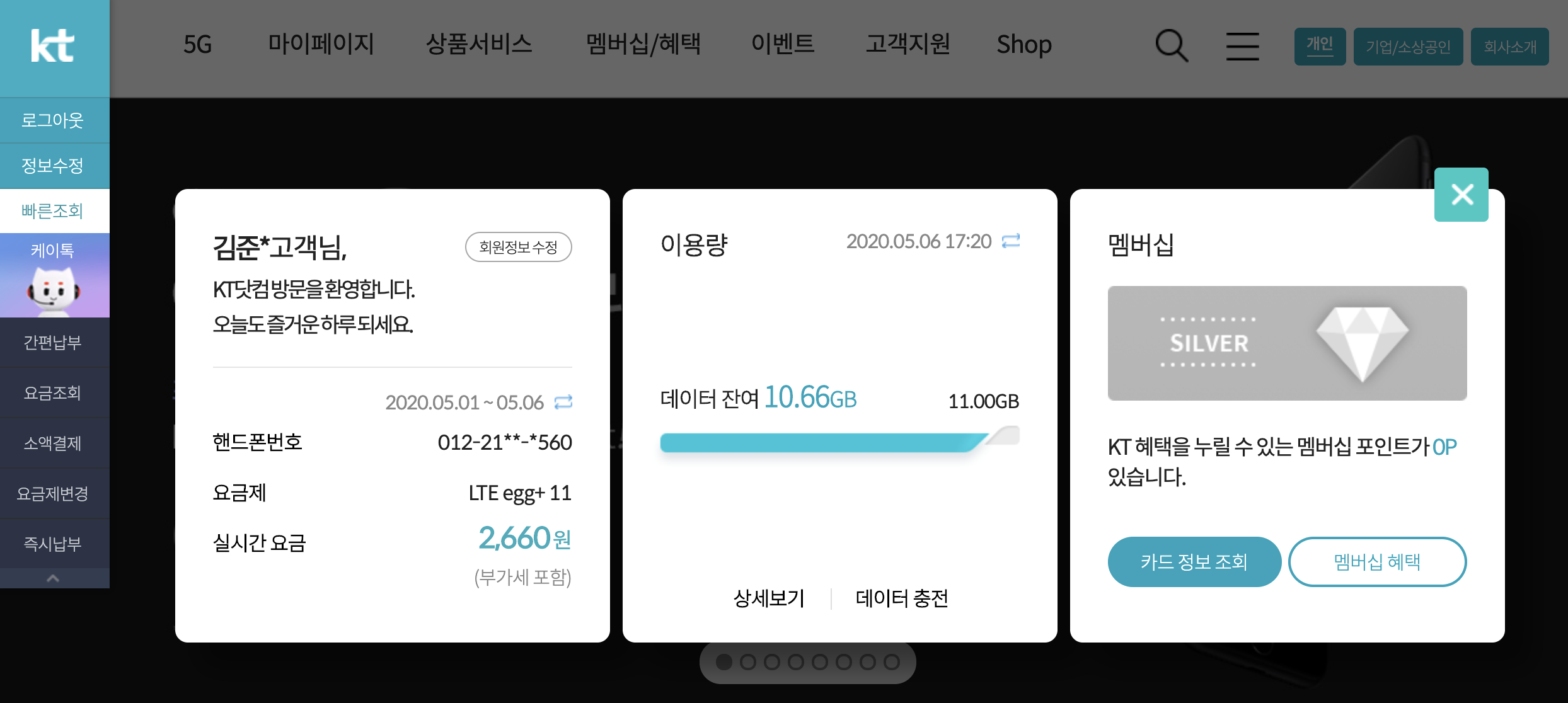 저는 egg와 집에서 사용하는 인터넷을 KT를 사용하고 있습니다. (참고로 휴대폰은 KT알뜰폰인데 KT망만 사용하기 때문인지 알뜰폰 정보는 나오지 않습니다.)