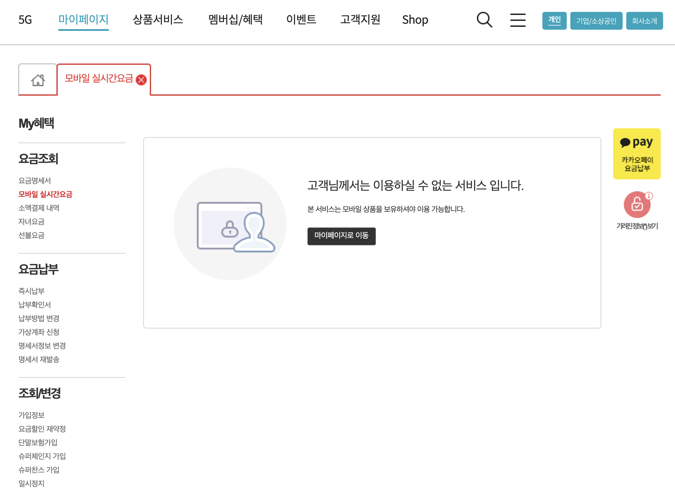 이런. 저처럼 휴대폰 통신사가 KT가 아닌 경우 이런 페이지가 나타납니다. 저는 egg를 사용하고 있는데 이런 경우 egg요금 정보 페이지로 바로 보내주면 좋겠습니다. 살짝 아쉽네요.