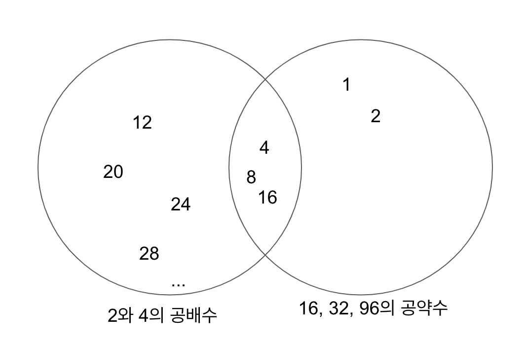 2와 4의 공배수이면서 16, 32, 96의 공약수인 숫자는 4, 8, 16입니다.