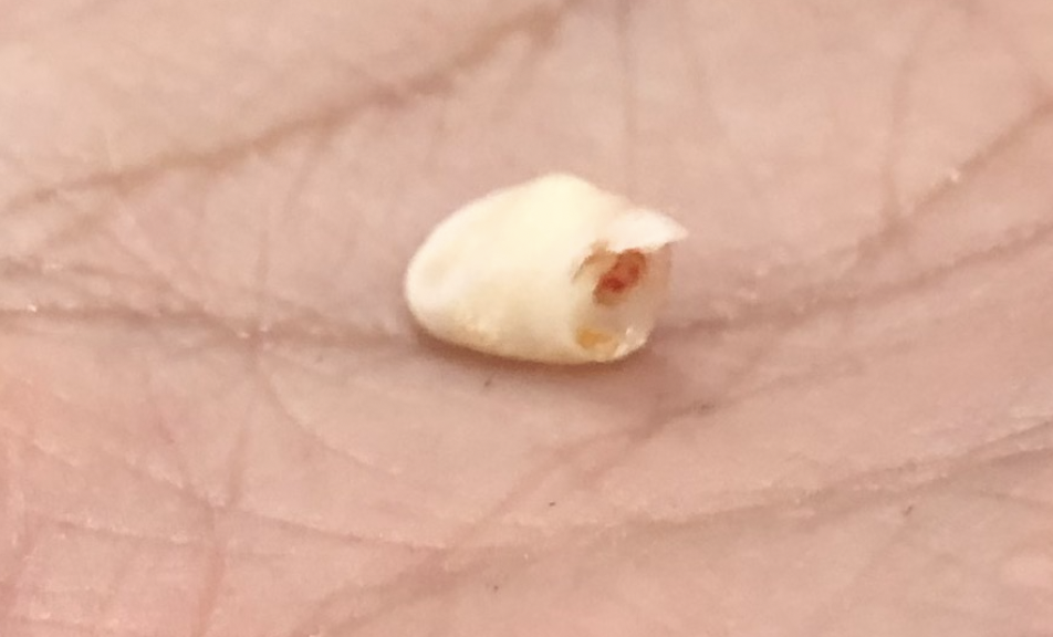 부러진 이빨의 모습입니다. 뿌리 부분이 한쪽은 있고 한쪽은 부러진 상태인 거 같습니다.