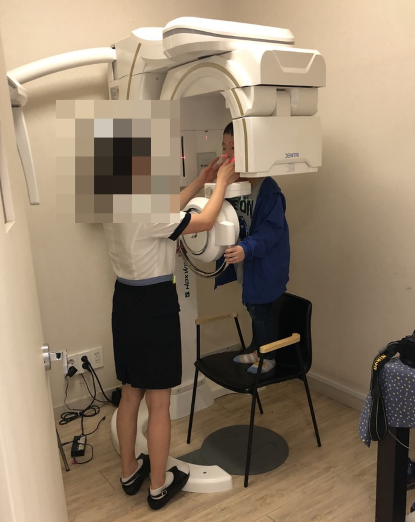 별다른 문제는 없는지 엑스레이를 찍자고 하더군요. 어린이 치과가 아니다 보니 높이가 안 맞아서 의자를 밟고 올라가서 찍었습니다.
