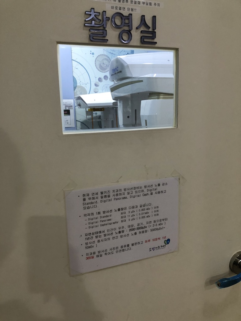 지난번 병원에서도 엑스레이를 찍었지만 이 병원에서 찍은 건 아니라 또 찍어야 되더군요. 아마 지난 병원에서 받아왔으면 되었을 거 같기도 하지만 아무튼 요런 건 좀 자동으로 병원 간에 공유가 되었으면 좋겠네요. 방사선에 자꾸 노출이 된다는 건 아무래도 조금 찜찜하니까요. 그래서 촬영하시는 분께 여쭤 보니 방사선량이 적어서 괜찮다고 하시더군요. 문 앞에도 안내문이 있었습니다. 방사선 노출을 최소화하고 있고 많이 찍어도 문제가 없다는 안내문이 있었습니다.