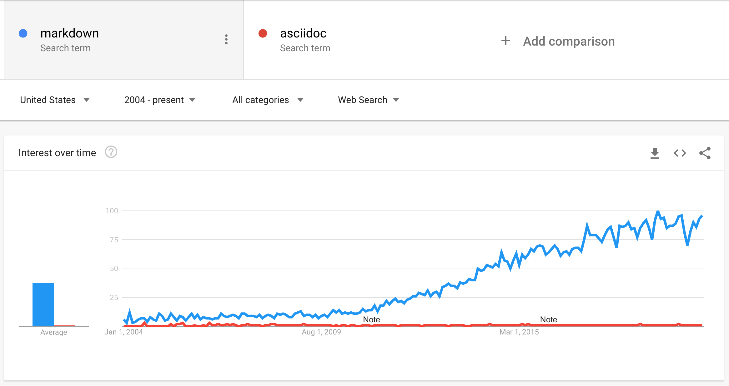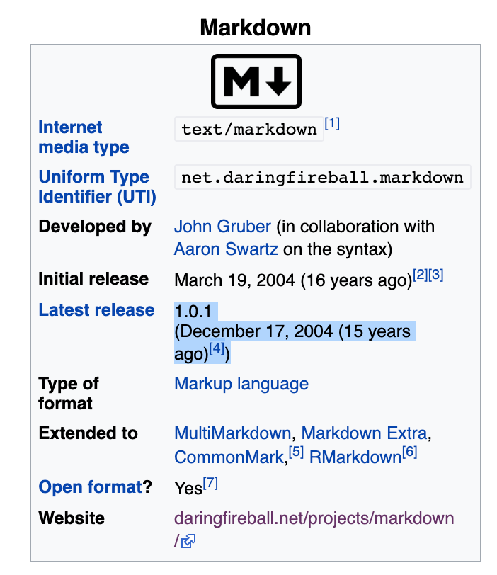 아아니... MarkDown은 심지어 2004년이 마지막 릴리즈였군요. AsciiDoc이 좀 더 최신(?) 기법이라고 봐도 되지 않을까 합니다. MarkDown이 이렇게 오래된 것이었다니 새삼 놀랍군요.