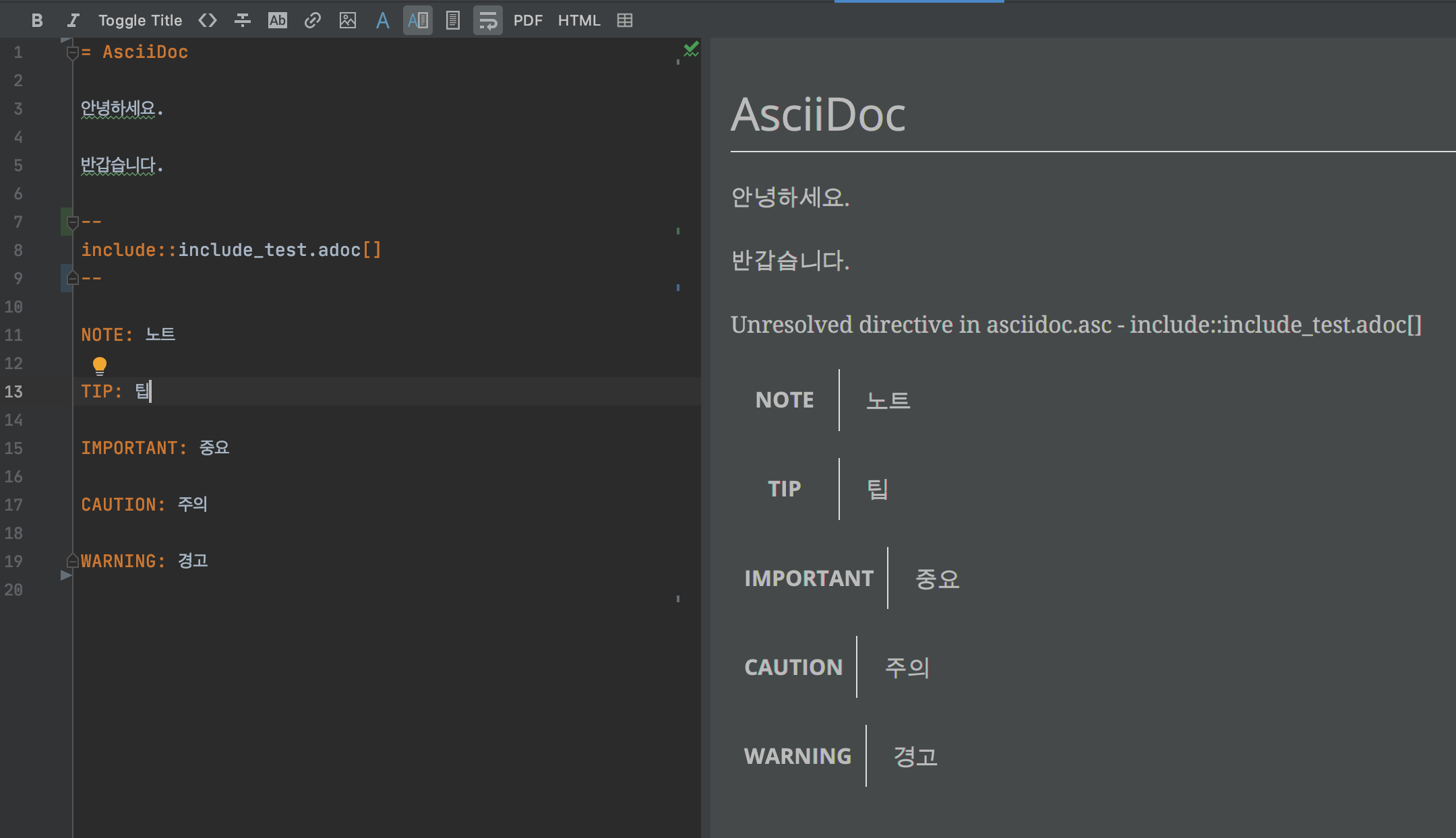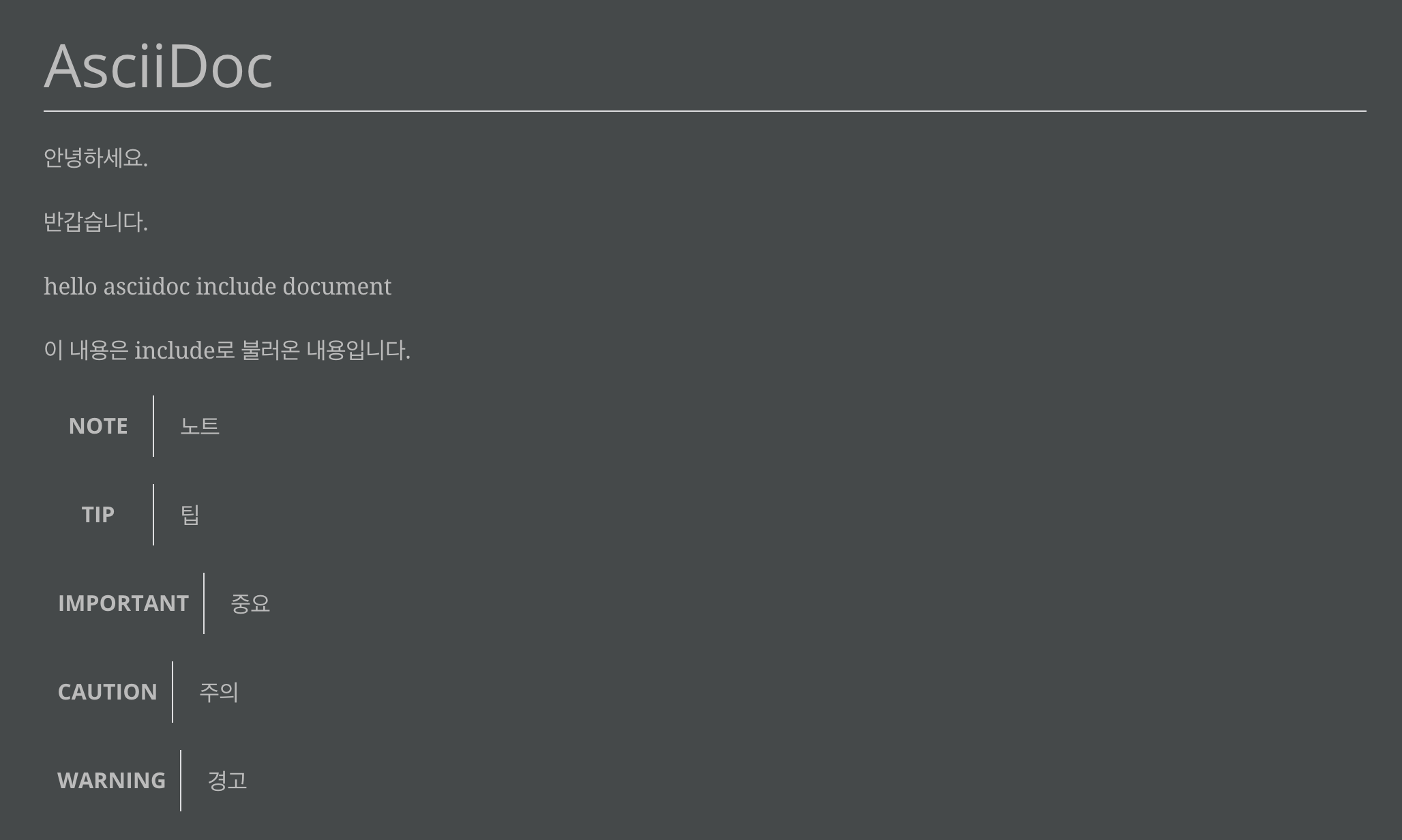 참고로 github에서도 AsciiDoc문서의 미리보기는 제공하고 있지만 include기능 까지는 제공해 주고 있지는 않습니다.