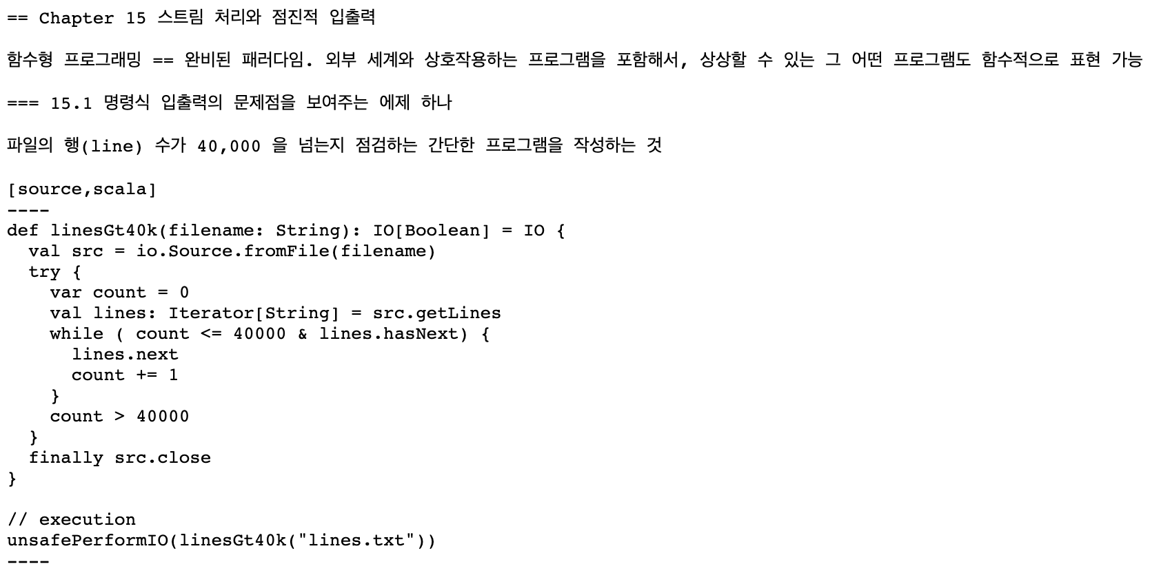 코드 구문은 MarkDown이라면 ```로 감쌌을 텐데 ---로 감싸고 있습니다. 그리고 ---위에 [source, scala]라고 적어 주고 있습니다. MarkDown이었다면 ```scala라고 했을 텐데 MarkDown이 좀 더 간결한 느낌이 듭니다.
