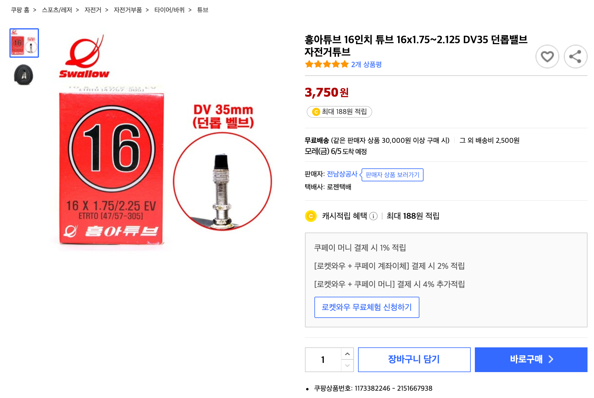 미리 구입 해 두고 다음에 고장 나면 직접 교체해볼까 싶기도 하네요. 직접 교체하면 배송비 고려하면 6750원 정도 이익이네요. 첫째 자전거는 18인치이니 첫째 거도 미리 사둘까 싶기도 합니다. 직접 고치면 이익이긴 하겠지만 고장 내면 손해가 더 클지도 모르겠네요 ^^;