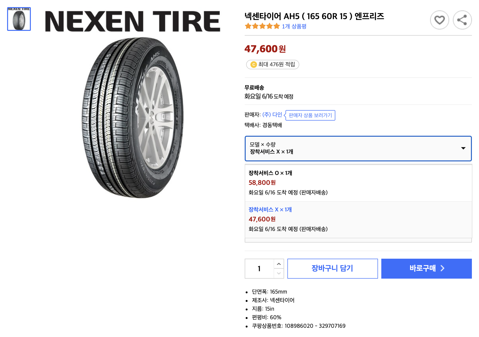 타이어 모델은 OPERA P165/60R 15 77H라고 적혀 있네요. 똑같은 건지는 모르겠지만 인터넷에 비슷한 모델이 좀 더 싸게 팔고 있긴 합니다.