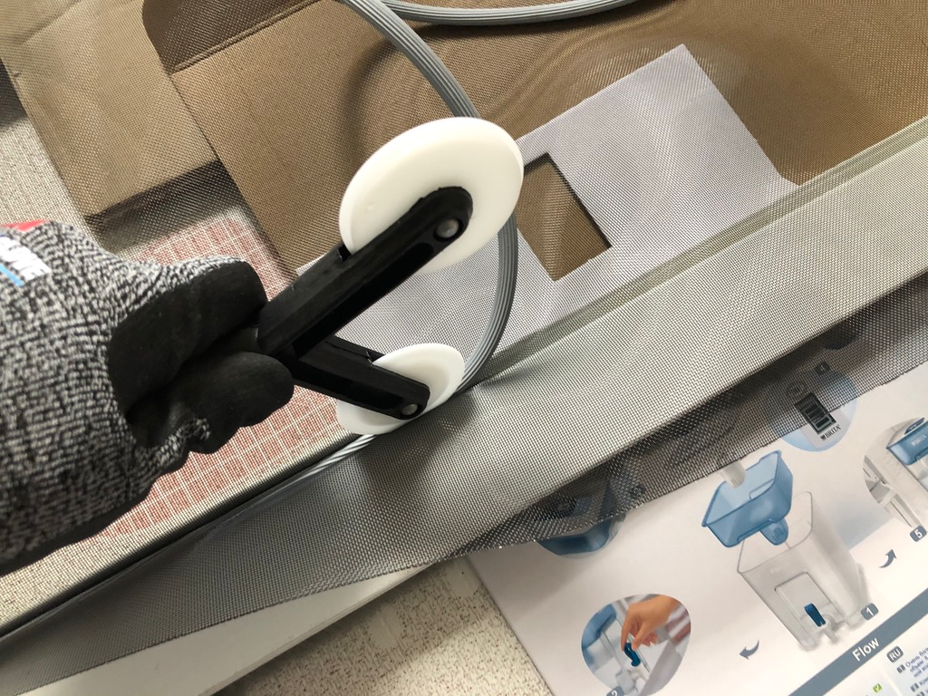 아 안전한 작업을 위해 3M NBR 안전장갑 L사이즈도 하나 구입했습니다. 가격은 3,880원입니다. 롤러는 ㄱ자로 홈이 있는 롤러 부분과 일자형으로 된 롤러가 있는데요. ㄱ자로 홈이 있는 롤러는 금속 재질의 방충망 작업 시 미리 홈에 맞춰 눌러 줄 때 사용하는 건데요. 홈에 맞춰 눌러 주고 고무패킹은 일자형 롤러로 밀어 넣어 주는 방식입니다. 그런데 제가 사용한 방충망은 금속 재질이 아니라 그런 작업을 해 줄 필요 없이 패킹을 바로 밀어 넣으면 되었습니다. 방충망이 너무 비뚤어지지 않을 정도로 적당히 고정시켜 주면서 고무패킹을 밀어 넣어주면 됩니다. 상하좌우를 ㅁ이라 했을 때 ㄴ자 면 정도만 먼저 패킹을 넣어 줍니다. 나머지 부분은 방충망이 울지 않도록 적당히 팽팽히 당겨 주면서 작업을 해 줍니다.