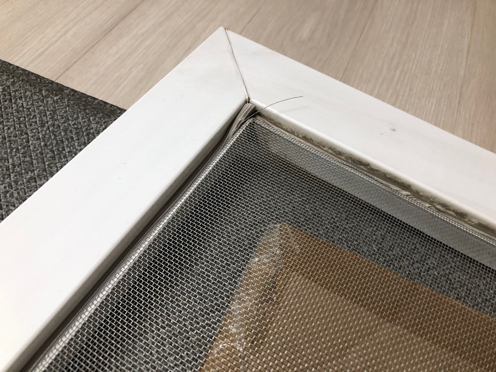 기존 방충망을 떼어 내어야 하는데요. 고무패킹을 먼저 뜯어내야 합니다. 한쪽 끝 부분이 저렇게 뽑기 좋게 나와 있더군요. 쭉쭉 잡아당겨서 고무패킹을 뜯어 내고 방충망도 뜯어낼 수 있었습니다.