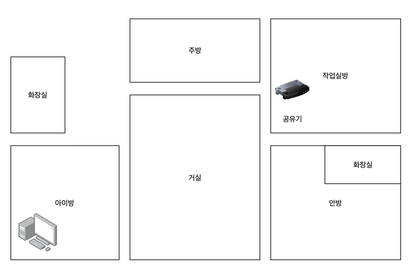 저희 집 구조는 대충 요렇게 되어 있습니다. 아이방에 데스크톱을 세팅을 하게 되었는데요. 문제는 데스크톱은 유선랜만 사용할 수 있었습니다. 공유기가 작업실 방에 있다 보니 유선랜을 설치 하기에는 거실을 가로질러야 되기 때문에 복잡해집니다.