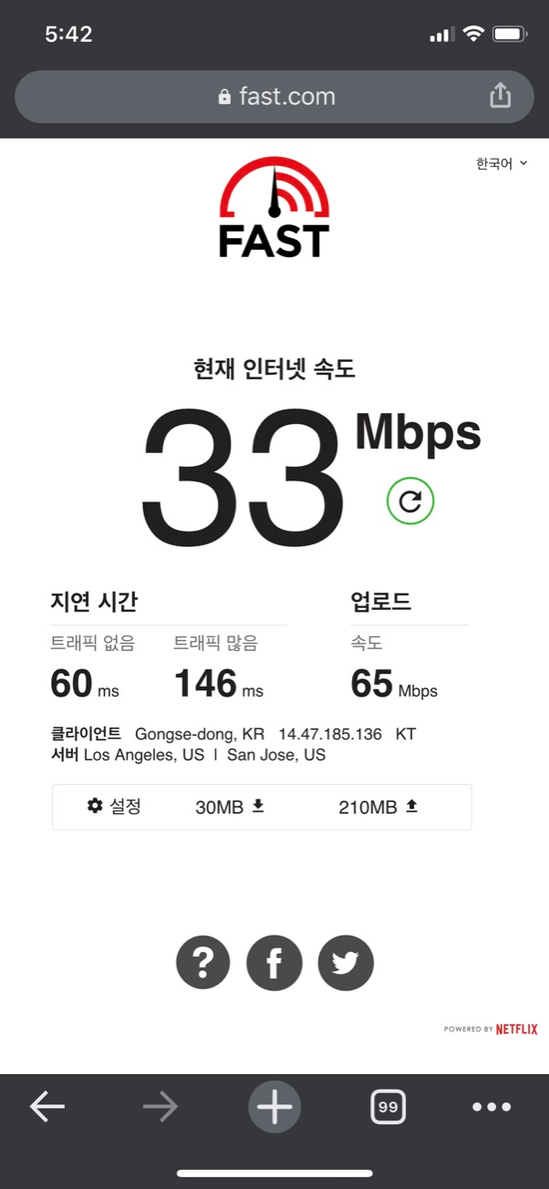 참고로 공유기가 있는 방에서는 33 Mbps 정도 나왔습니다.