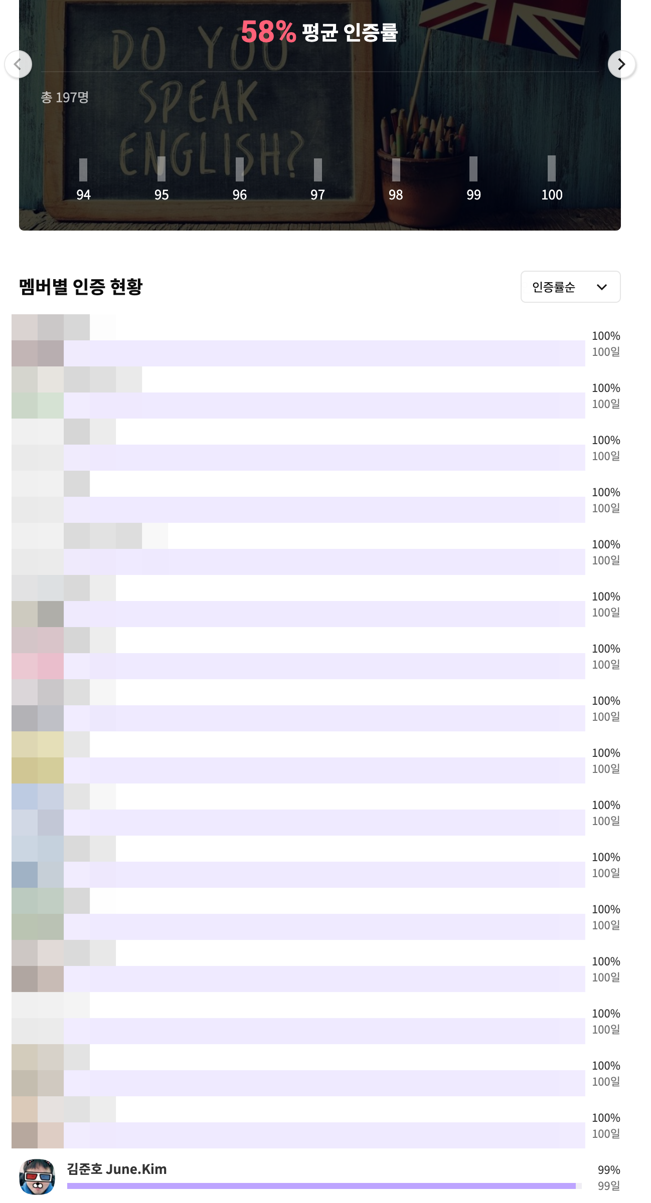 여긴 블로그 포스팅 때와 같은 시기에 개인 사정으로 하루를 못했었는데요. 여긴 100% 달성 멤버들이 많군요. 저도 하루만 더 했었으면 100% 였을 텐데 아쉽습니다.