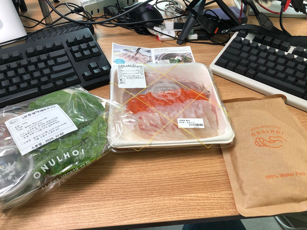 온라인 회식을 하기에 좀 애매한 부분은 배송시간인데요. 배송 시각을 지정할 수 없기 때문에 온라인 회식을 할 때 회가 도착하지 않으면 다른 사람들이 먹는 걸 지켜봐야 되는 문제가 있습니다.