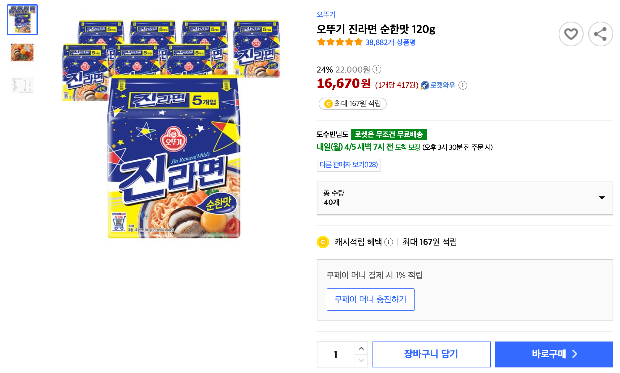 40개를 한꺼번에 사면 이마트 트레이더스보다 더 저렴해지긴 한데요. 진라면을 좋아하긴 하지만 6개월 정도의 유통기한 내에 진라면만 40개를 다 먹긴 쉽지 않을 거 같습니다. 24주 정도 잡고 1주일에 2개씩 먹으면 충분할 거 같기도 한데 아이들이 많이 먹게 되면 결국 40개씩 사게 되지 않을까 싶기도 하네요.