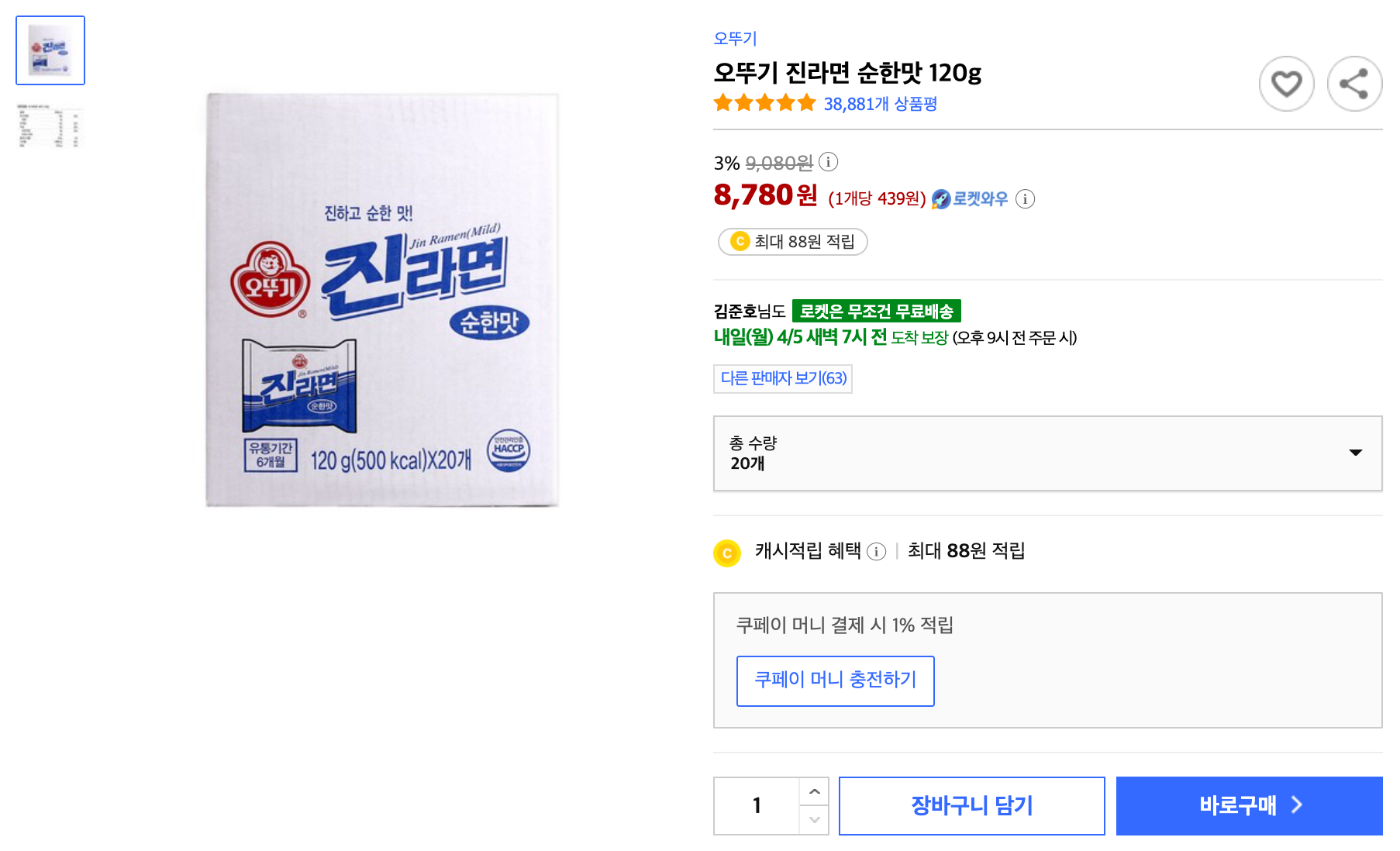 40개를 한꺼번에 사면 이마트 트레이더스보다 더 저렴해지긴 한데요. 진라면을 좋아하긴 하지만 6개월 정도의 유통기한 내에 진라면만 40개를 다 먹긴 쉽지 않을 거 같습니다. 24주 정도 잡고 1주일에 2개씩 먹으면 충분할 거 같기도 한데 아이들이 많이 먹게 되면 결국 40개씩 사게 되지 않을까 싶기도 하네요.