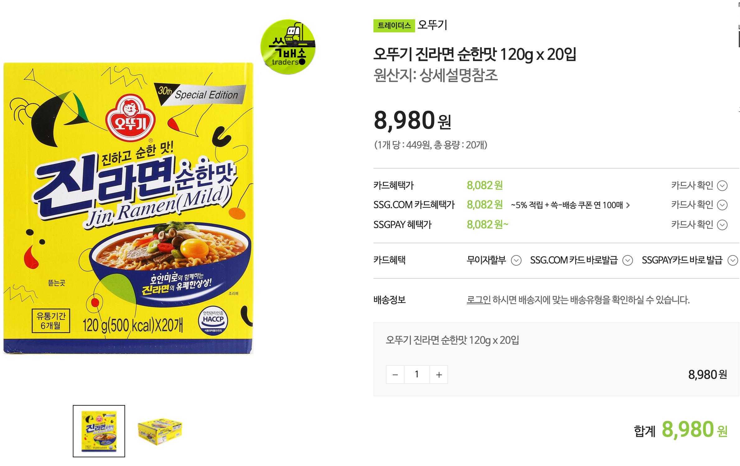 트레이더스의 진라면은 120g x 20입이 8,980원입니다. 개당 449원입니다. 이마트 트레이더스 삼성카드를 사용하면 한 달에 한번 사용할 수 있는 5% 할인 쿠폰도 주고 한 달에 한 번은 10만 원 이상 결제 시 6,000원 할인도 됩니다. 항상 받을 수 있는 할인은 아니긴 해서 좀 애매하긴 하지만 조금은 더 할인해서 살 수 있다고 볼 수 있습니다.