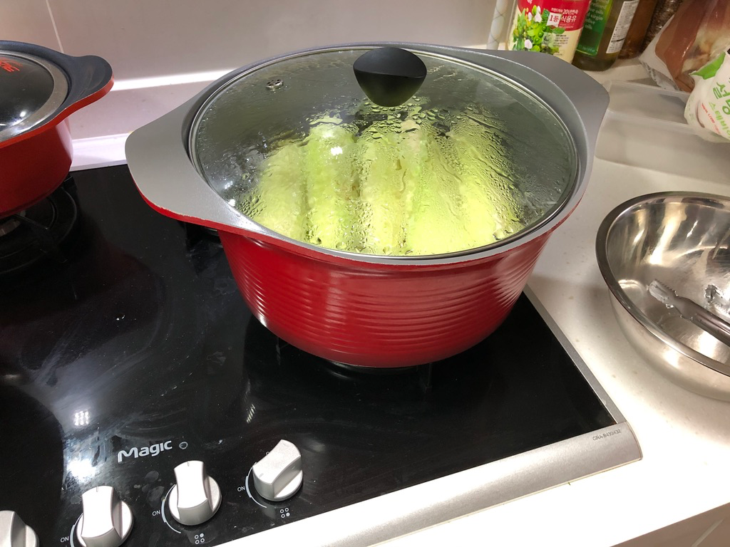 30분 후 아래쪽 옥수수를 위로 올리고 다시 30분간 삶아 줍니다.