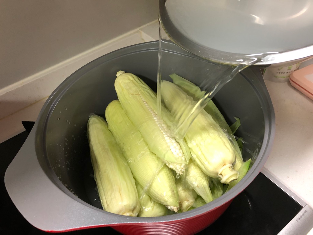 옥수수를 직접 삶아 본 건 몇 년 만인지 모르겠습니다. 직접 삶아 먹으면 번거로운 것에 비해 맛없게 삶아지는 경우가 많아서 전자레인지에 돌려 먹는 간편식 옥수수를 사 먹거나 초당옥수수를 먹곤 했습니다.