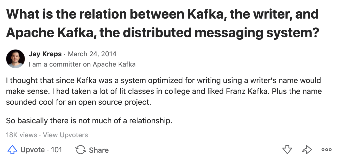 Kafka라는 이름은 개발자 중 한 명인 Jay Kreps가 지었습니다. writing에 최적화되어서 작가의 이름을 따는 게 적합하다 생각했고 카프카 작가의 작품을 좋아했기 때문이라고 합니다. 오픈소스 프로젝트명으로 멋지다고 생각했고요.