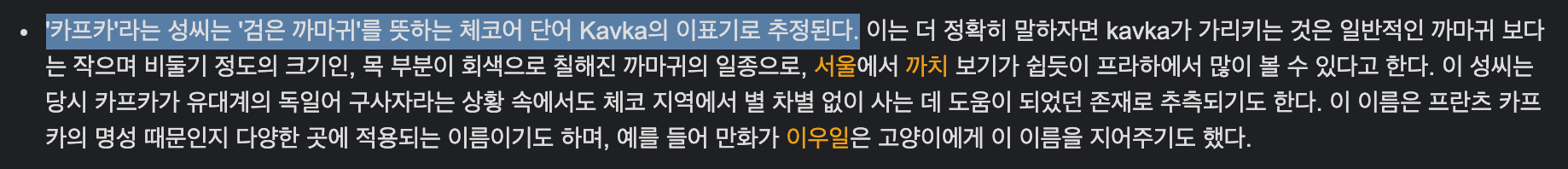 Kafka는 검은 까마귀를 뜻하는 체코어 Kavka에서 따왔다고 추정됩니다. 좀 더 근거 있는 내용은 찾지 못했지만 여러 글들에서 그러한 내용이 발견됩니다.