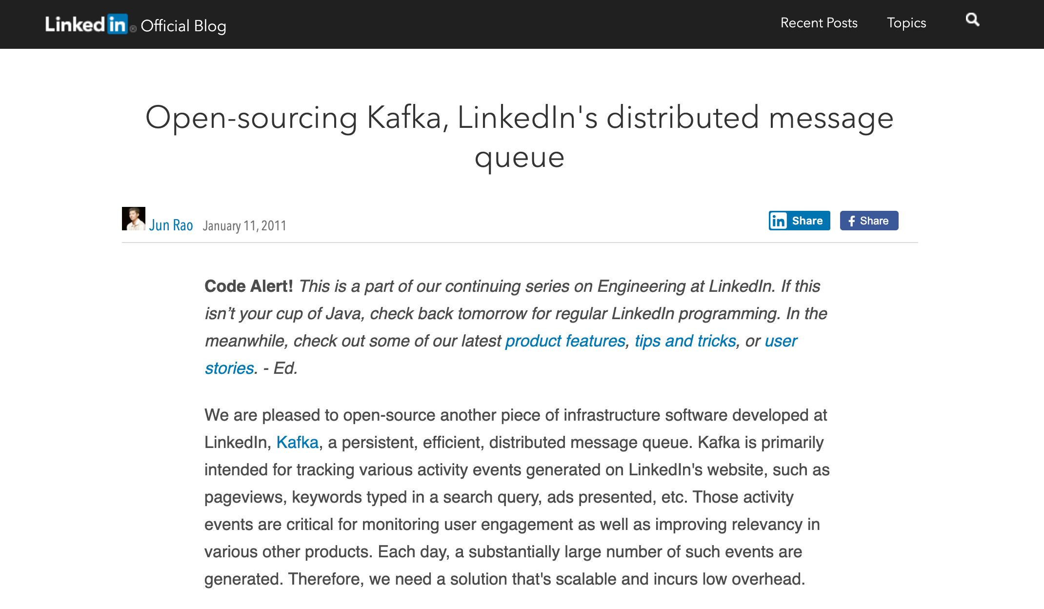 분산 메시징 시스템 카프카(Kafka)의 간단한 역사와 이름의 의미 본문