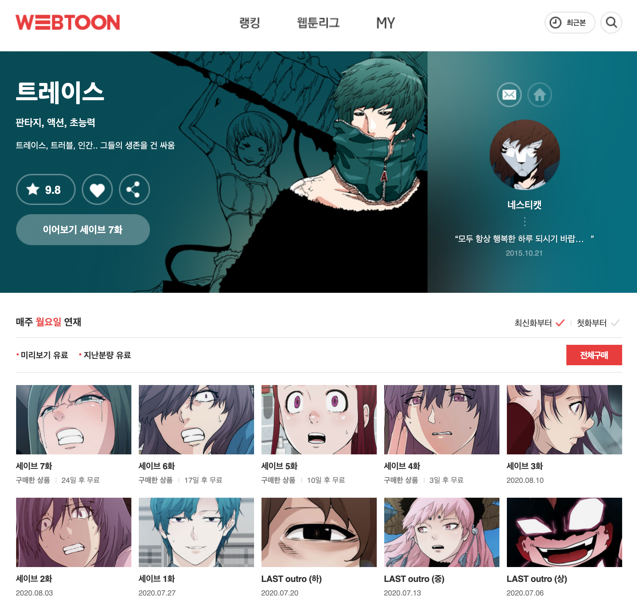 최근에 LAST가 연재되어서 이제 끝날 때가 되었나 했는데 아직도 계속 연재되고 있습니다. 혹시나 억지로 연장하는 게 아닐까 싶기도 했지만 여전히 흥미진진합니다. 과거에 뿌려두었던 떡밥들도 조금씩 계속 회수되고 있고요.