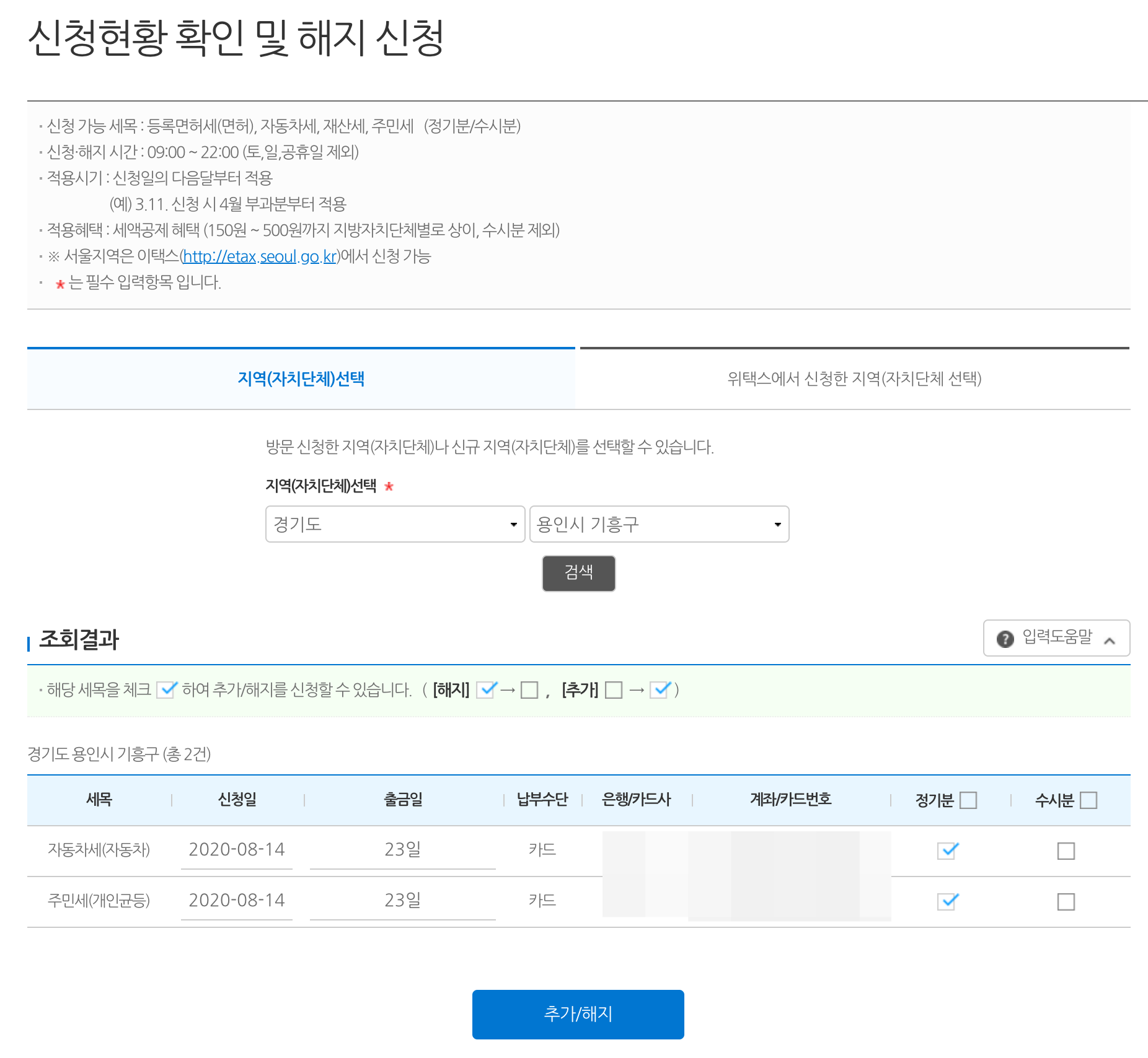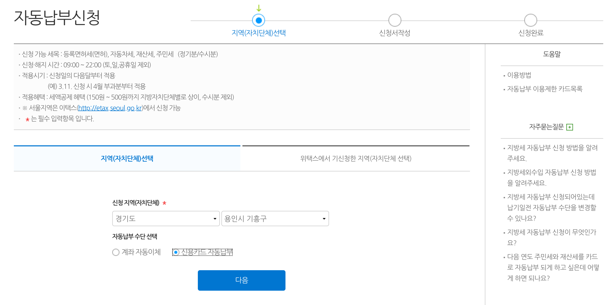 지역을 선택하고 저는 "신용카드 자동납부"로 선택했습니다. 계좌로 하면 잔고가 부족하면 실패할 거 같아 찜찜하네요.