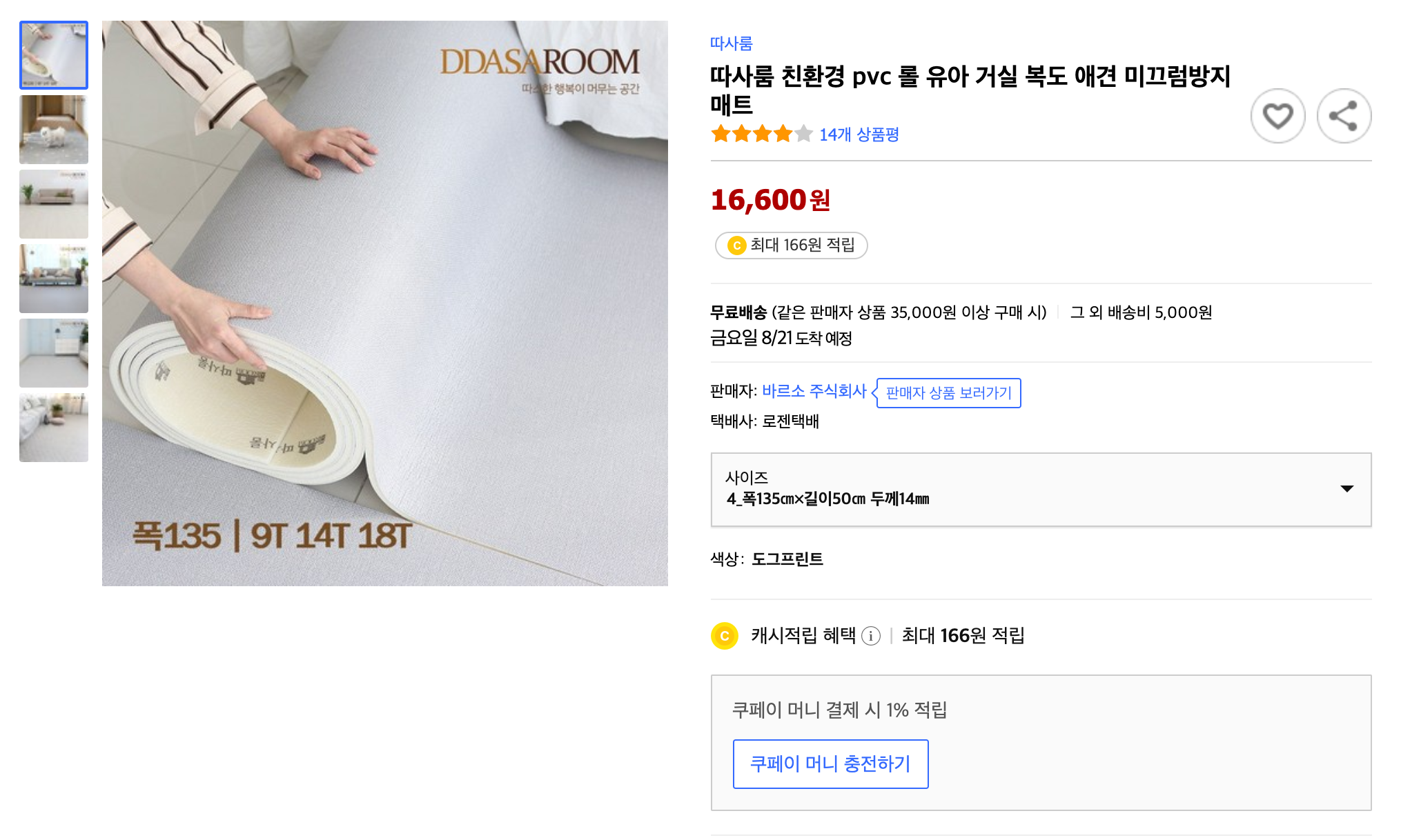 (쿠팡 구매 링크: https://coupa.ng/bH9PMA 에서 사이즈 135x50x1.4cm로 변경. 이 링크로 구매하면 저에게 조금의 이익이 생길 수 있습니다. 1cm^3당 가격은 1.6원.)