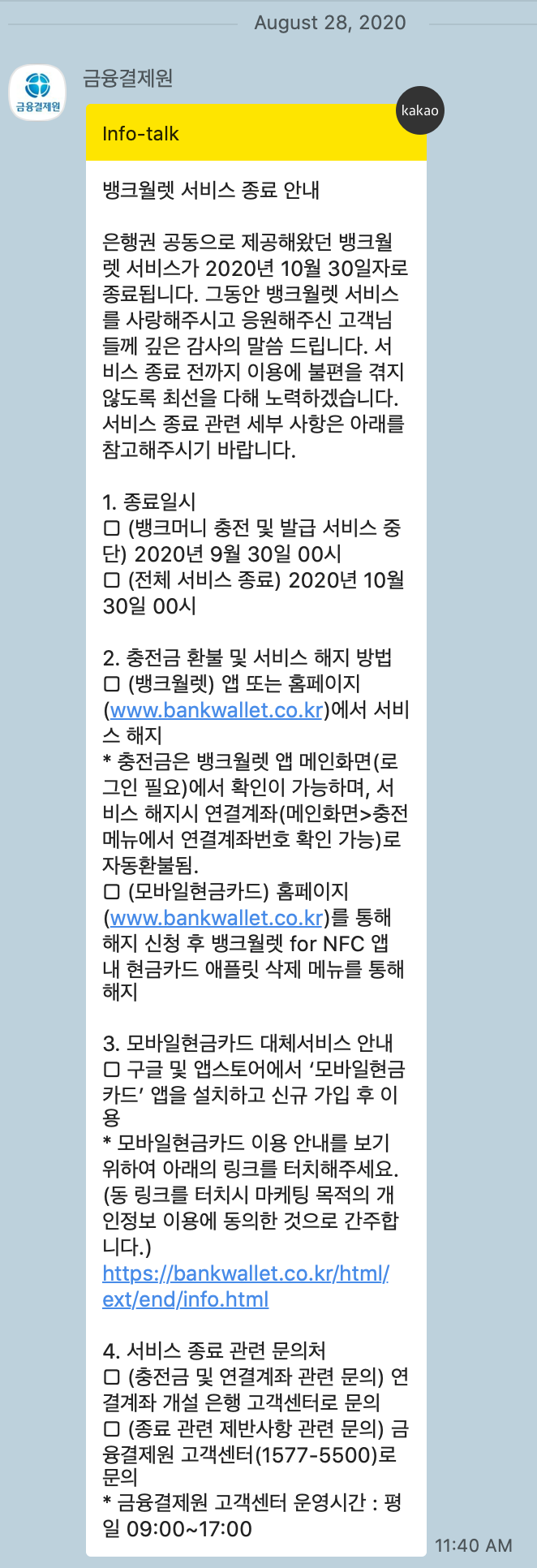 카톡으로 문자가 왔습니다. 뱅크월렛 서비스를 종료한다고 합니다.