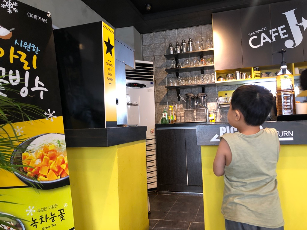 잘 안 보이지만 눈꽃빙수를 만들어 내는 기계가 있습니다. 첫째가 신기하게 쳐다보고 있습니다.