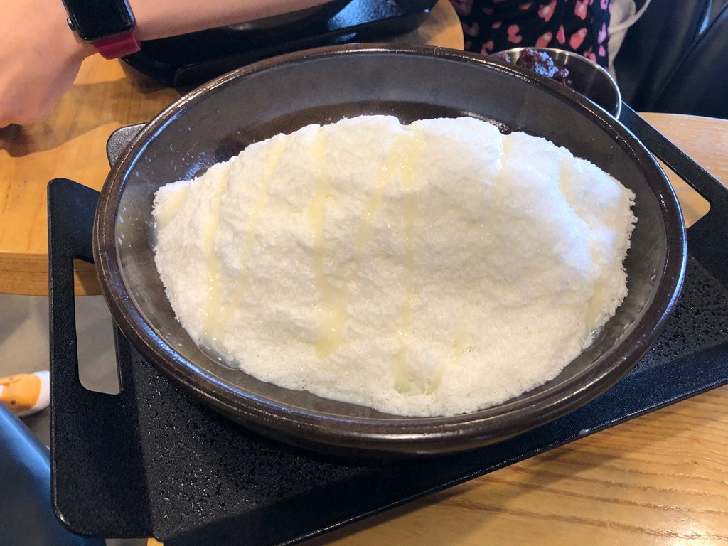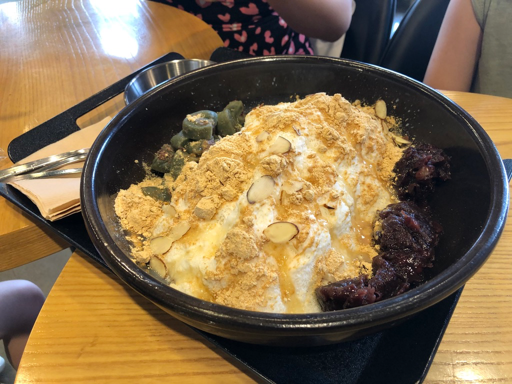 팥빙수에는 우유 베이스 눈꽃 얼음과 연유 시럽, 팥, 떡, 아몬드, 콩가루가 뿌려져 있는데요. 아이들은 다른 거 얹지 않고 하얀 거로만 먹고 싶다고 하더군요. 물론 저도 사실 이런 스타일을 더 좋아합니다.