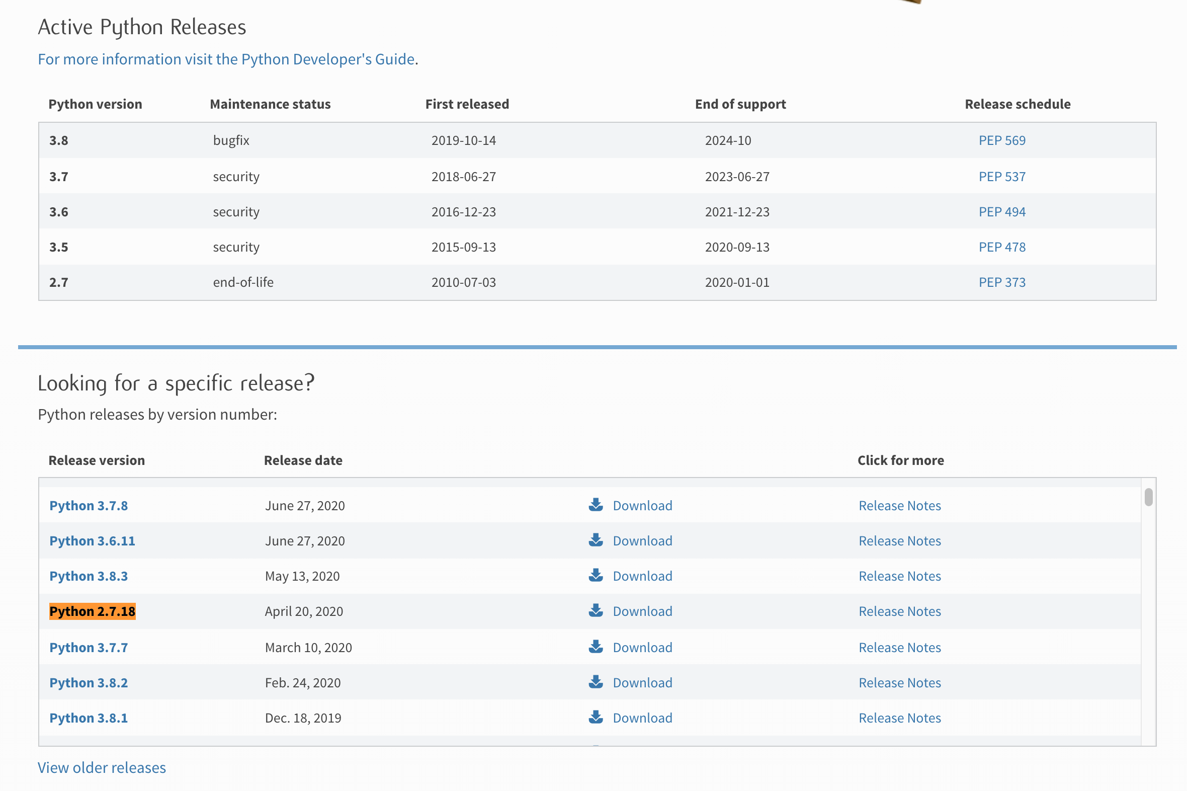 www.python.org/downloads/에서 캡처한 Active Python Releases입니다. Python 2.7 버전이 2020년 1월 1일을 기점으로 지원이 종료되었습니다. 그런데 아래쪽을 보면 2.7.18이 2020년 4월 20일에 릴리즈 되었습니..