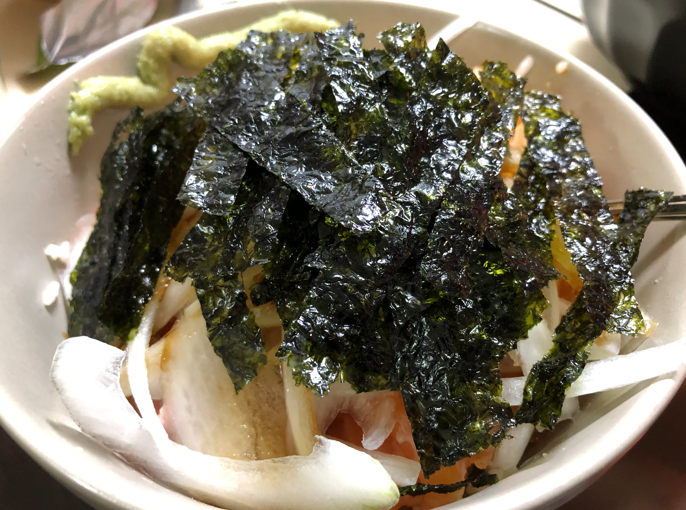 양파랑 김에 가려서 연어가 보이지 않지만 아마 식당에서 먹는 연어의 두배 이상은 올라갈 거 같네요.